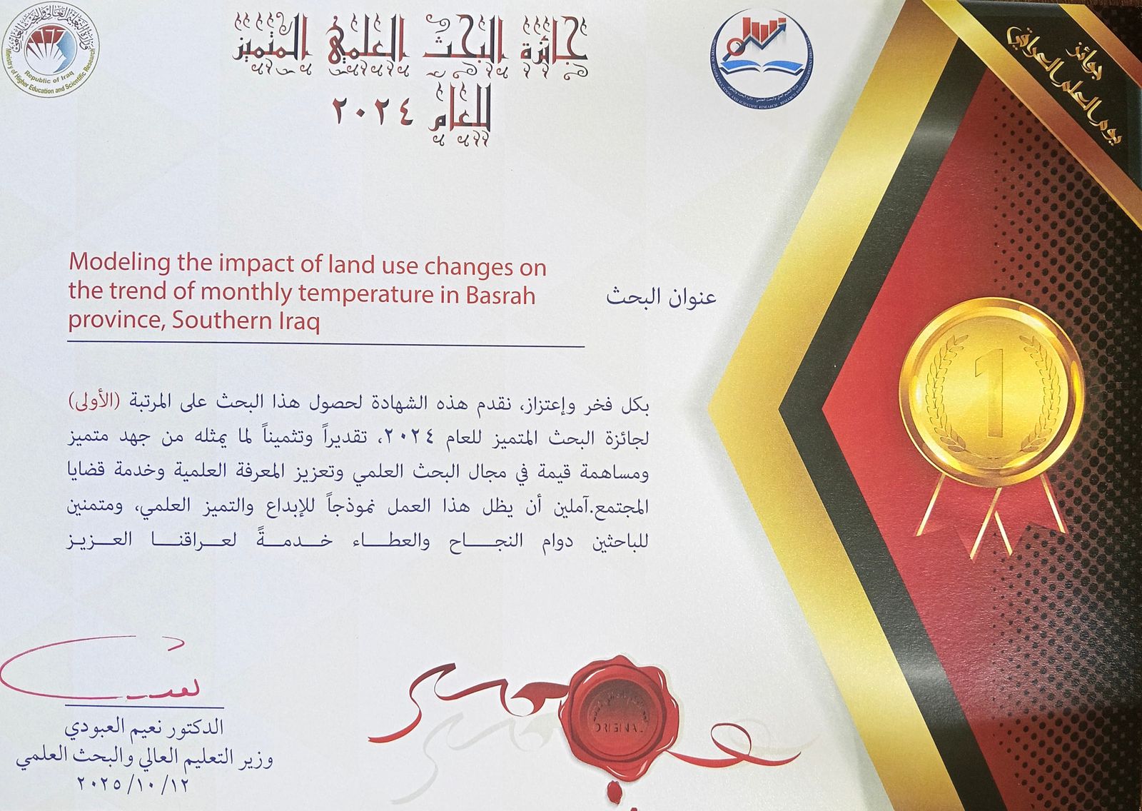 وجاء هذا الإنجاز بعد مشاركة البحث الموسوم:"Modeling the impact of land use changes on the trend of monthly temperature in Basrah province Southern Iraq" والمقدم من قبل الدكتور صفاء عبد الأمير رشم الأسدي.
