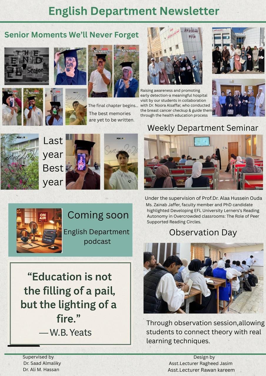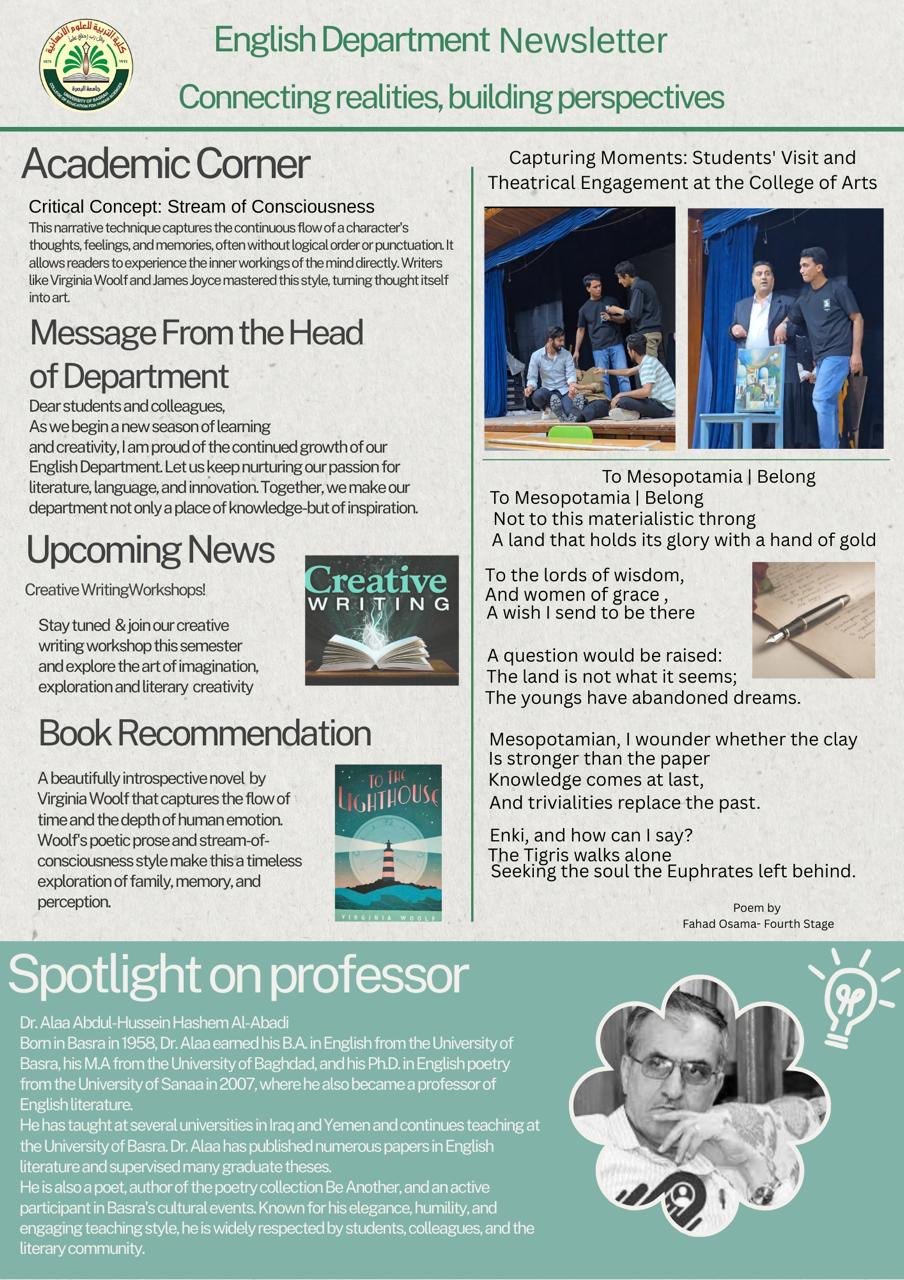 أصدر قسم اللغة الإنكليزية في كلية التربية للعلوم الإنسانية بجامعة البصرة العدد الأول من الصحيفة الإخبارية الشهرية باللغة الانكليزية، لتعزيز التواصل الإعلامي داخل الكلية.