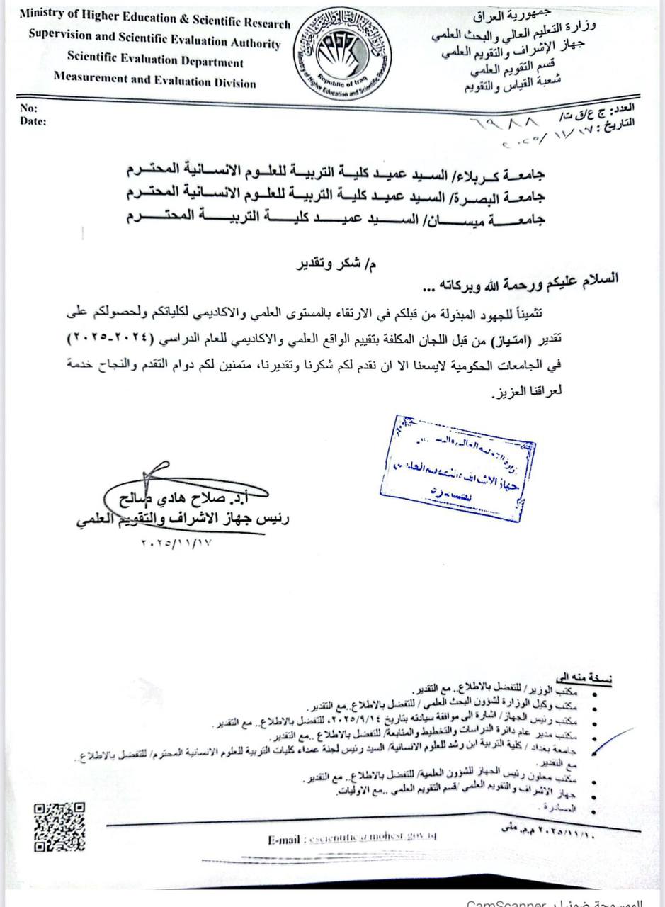 وقد حصل الدكتور وسام جمعة لفتة، عميد الكلية، كتاب شكر وتقدير من الدكتور صلاح هادي صالح، رئيس جهاز الإشراف والتقويم العلمي في الوزارة، تثميناً لجهود العمادة المتميزة ودورها الفاعل في الارتقاء بالمستوى العلمي والاكاديمي داخل الكلية.
