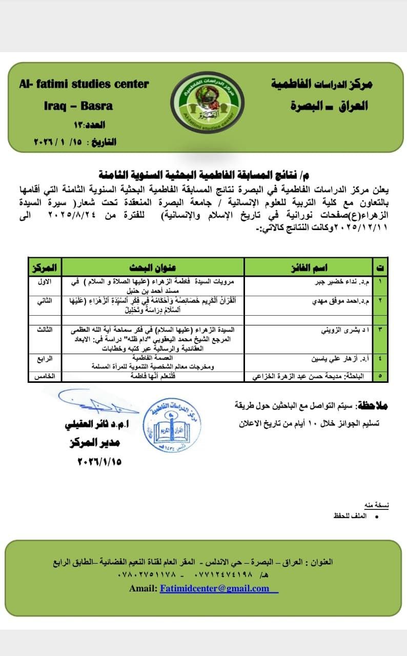 وقد جاء تتويج الدكتور احمد موفق مهدي عن بحثه (القرآن الكريم خصائصه واحكامه في فكر السيدة الزهراء عليها السلام: دراسة وتحليل)، سعى فيه الى قراءة القرآن الكريم من خلال الرؤية الفكرية للسيدة فاطمة الزهراء (عليها السلام)، وتعاملها مع النص القرآني فهما وتدبرا وتطبيقا.تدريسي في كلية التربية للعلوم الإنسانية تحصل على المركز الثاني في مسابقة علمية