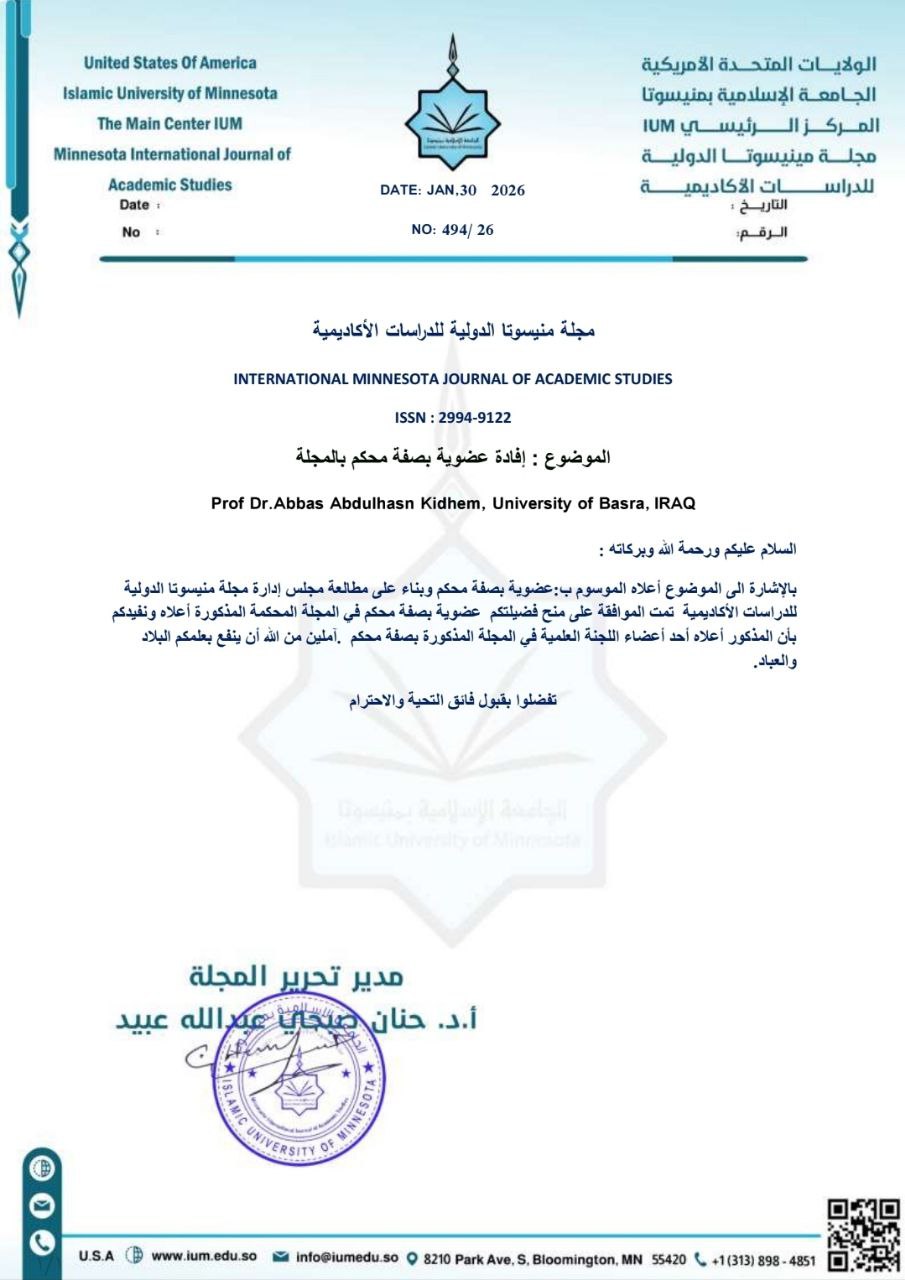 اختير التدريسي في كلية التربية للعلوم الإنسانية بجامعة البصرة الدكتور عباس عبد الحسن كاظم محكماً علميا في مجلة منيسوتا الدولية للدراسات الاكاديمية.