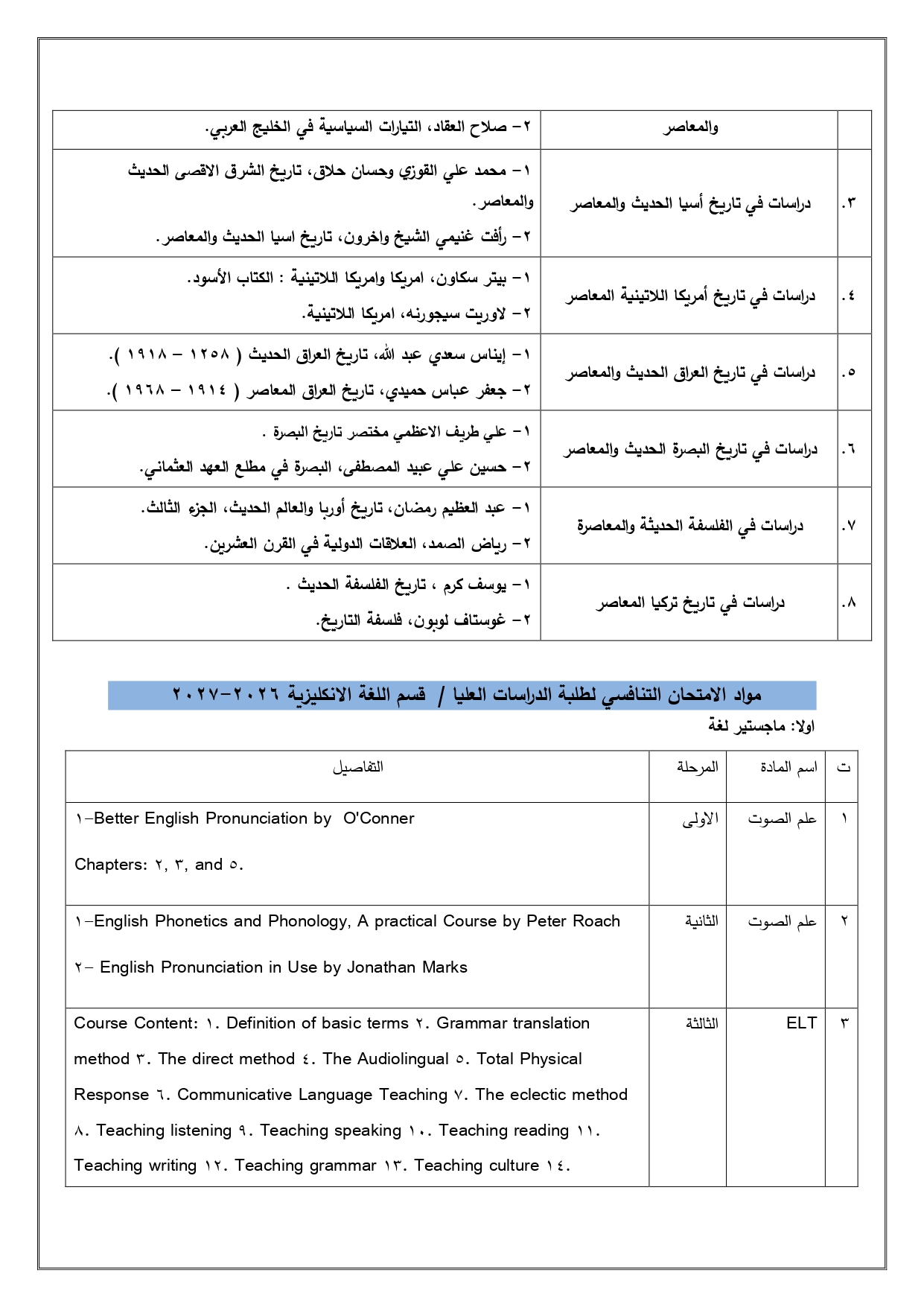 الخطة العلمية لقسم الانكليزي